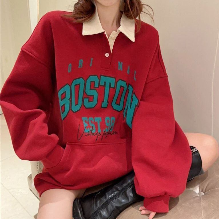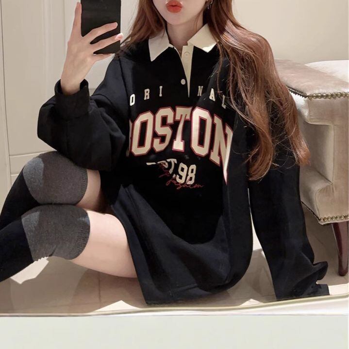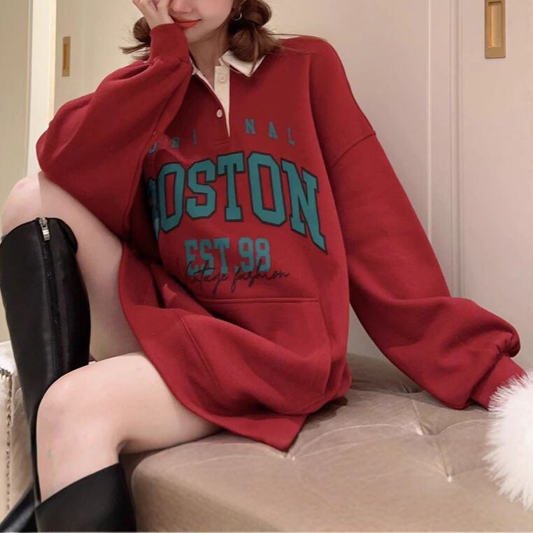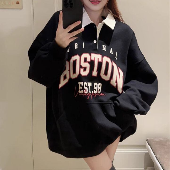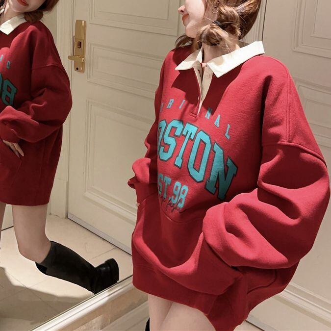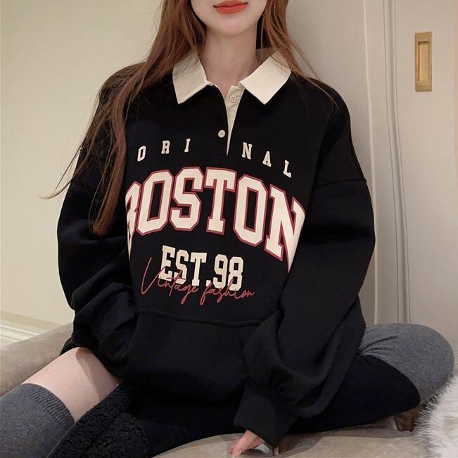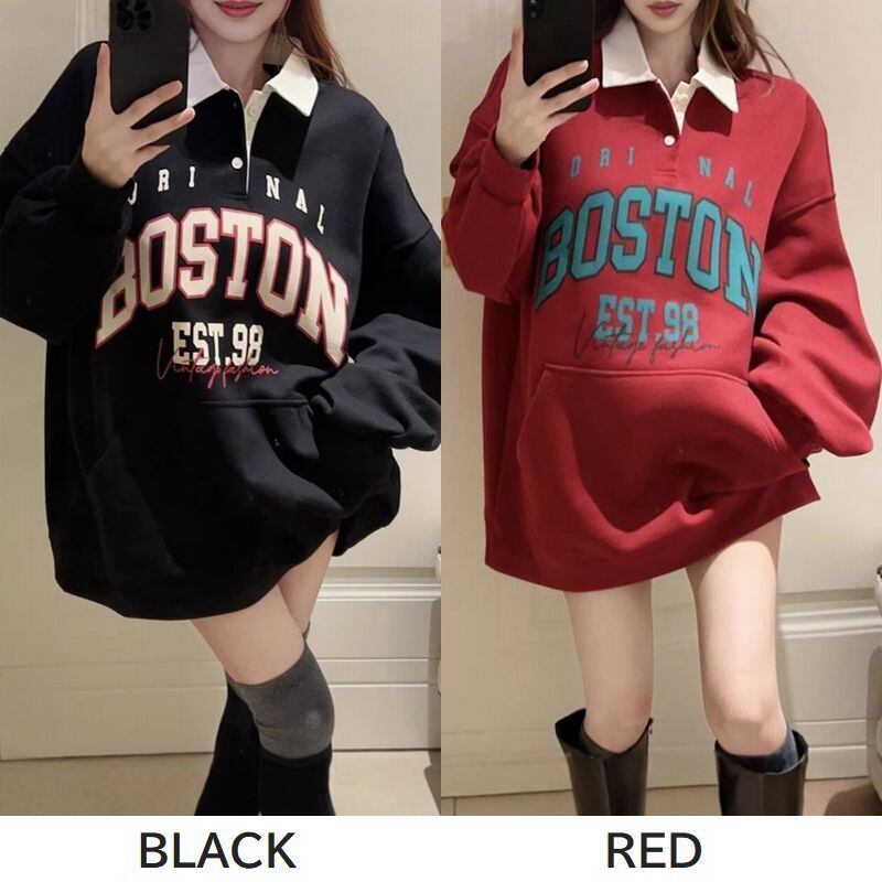 レディース レディースファッション ポロカラー トップス 大きめロゴ BOSTONプリント 配色 プルオーバー オーバーサイズ ゆったり ルーズ 長袖 レトロ 大人可愛い ガーリー カジュアル おしゃれ 通販 韓国 韓国通販 韓国ショッピング 韓国ファッション おるちゃん オルチャン オルチャンファッション 10代 20代 30代 40代 可愛い かわいい お洒落 レディス プチプラ 激安 安い コーデ コーディネイト 人気 おすすめ