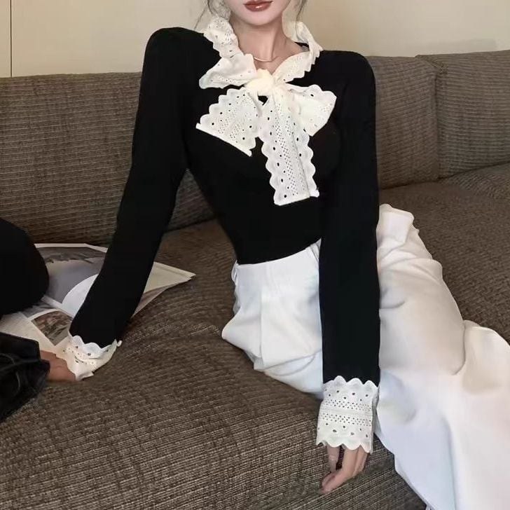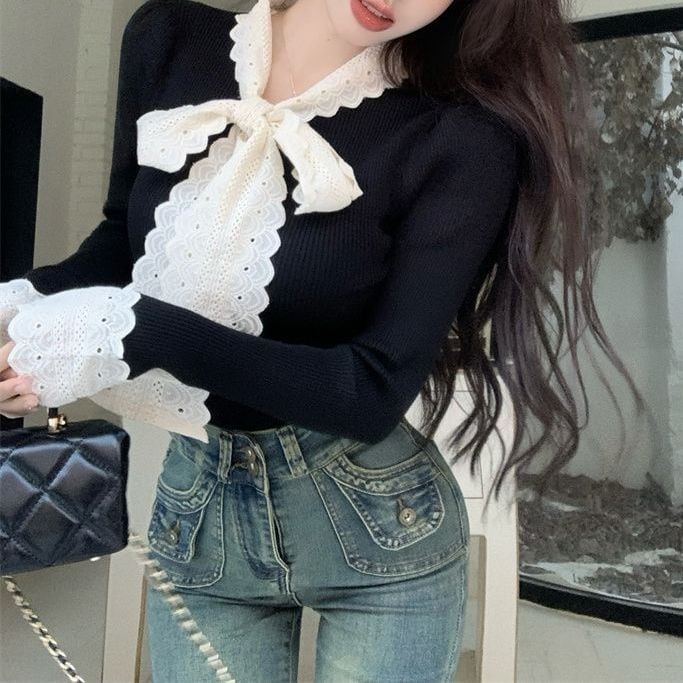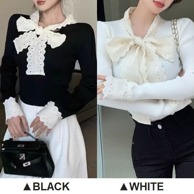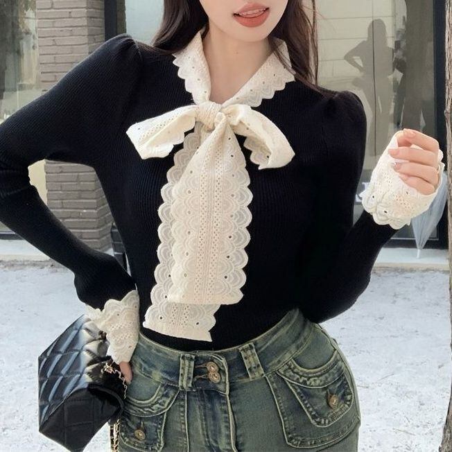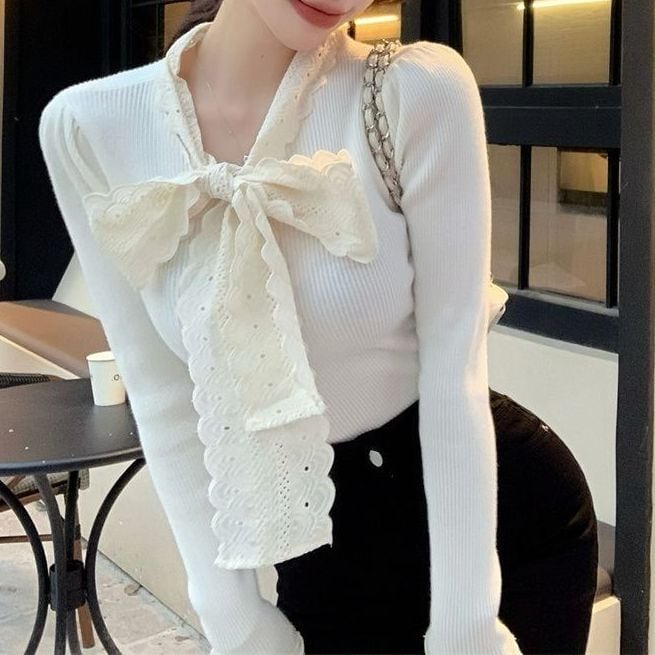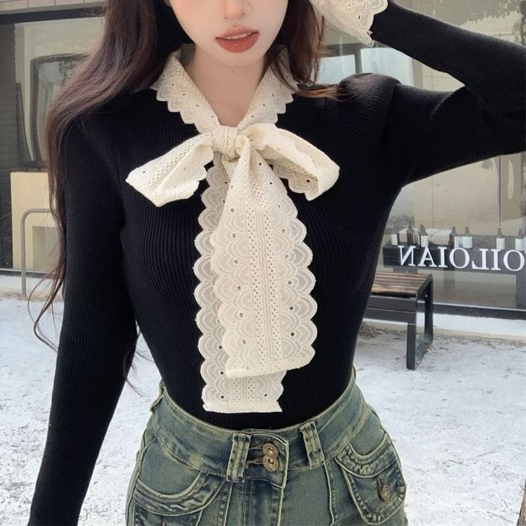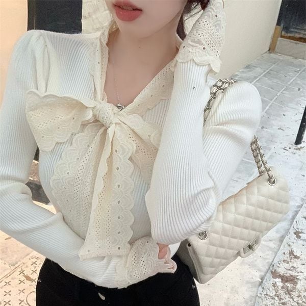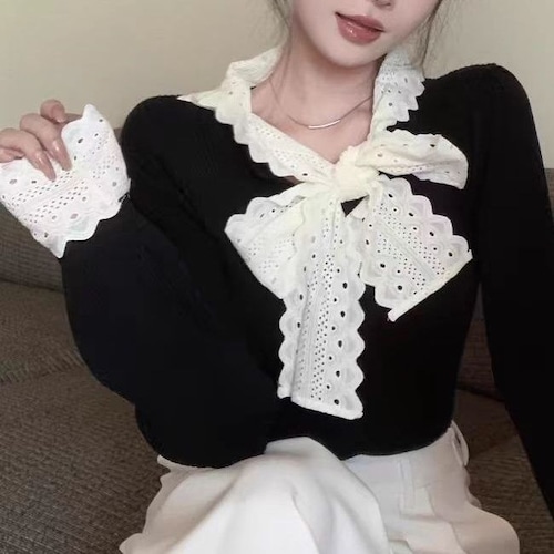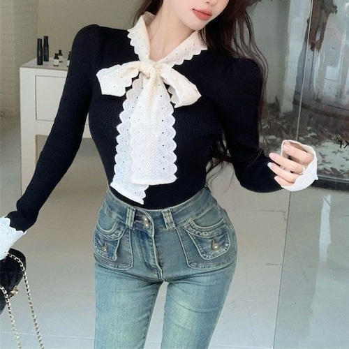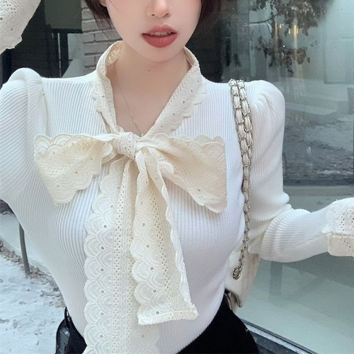 レディース レディースファッション ニット レース リボン フリル Vネック トップス リブニット スリムフィット 長袖 レトロ 大人可愛い ガーリー カジュアル おしゃれ 通販 韓国 韓国通販 韓国ショッピング 韓国ファッション おるちゃん オルチャン オルチャンファッション 10代 20代 30代 40代 可愛い かわいい お洒落 レディス プチプラ 激安 安い コーデ コーディネイト 人気 おすすめ