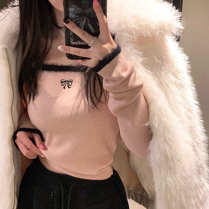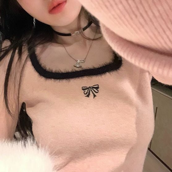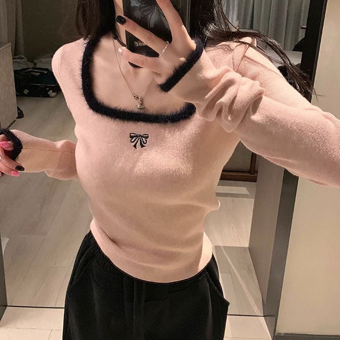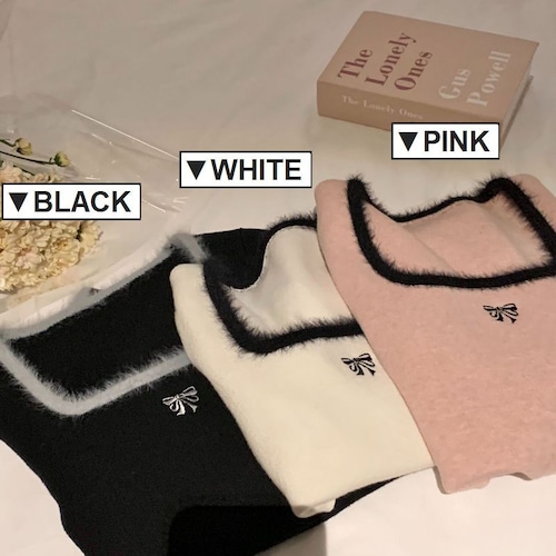 レディース レディースファッション ニット セーター トップス 配色リボン スクエアネック ショート丈 プルオーバー スリムフィット 長袖 レトロ 大人可愛い ガーリー カジュアル おしゃれ 通販 韓国 韓国通販 韓国ショッピング 韓国ファッション おるちゃん オルチャン オルチャンファッション 10代 20代 30代 40代 可愛い かわいい お洒落 レディス プチプラ 激安 安い コーデ コーディネイト 人気 おすすめ