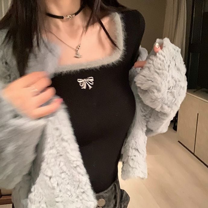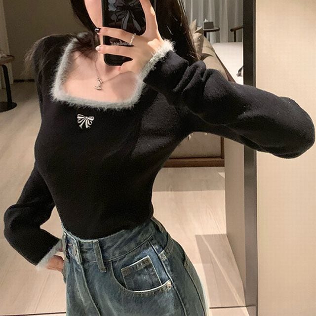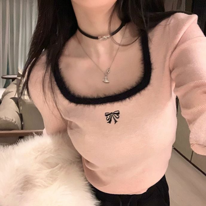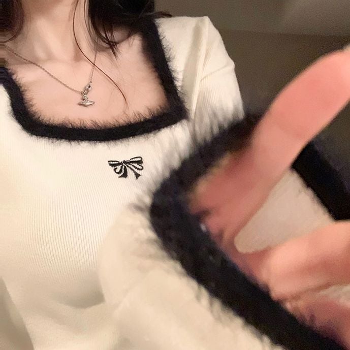 レディース レディースファッション ニット セーター トップス 配色リボン スクエアネック ショート丈 プルオーバー スリムフィット 長袖 レトロ 大人可愛い ガーリー カジュアル おしゃれ 通販 韓国 韓国通販 韓国ショッピング 韓国ファッション おるちゃん オルチャン オルチャンファッション 10代 20代 30代 40代 可愛い かわいい お洒落 レディス プチプラ 激安 安い コーデ コーディネイト 人気 おすすめ