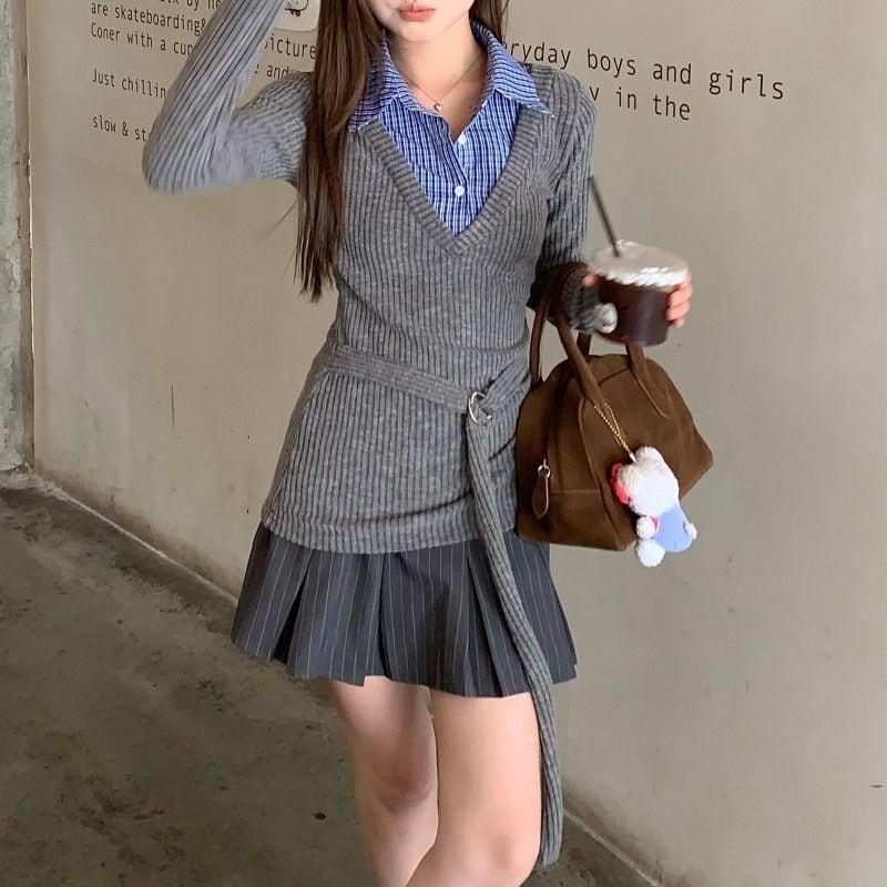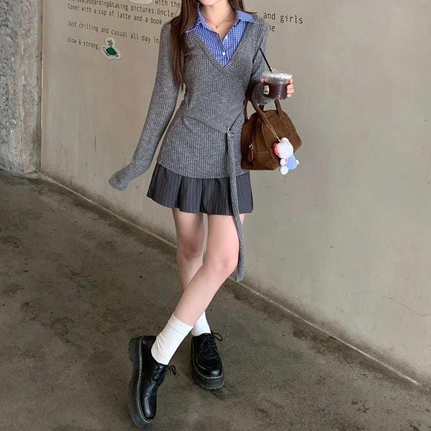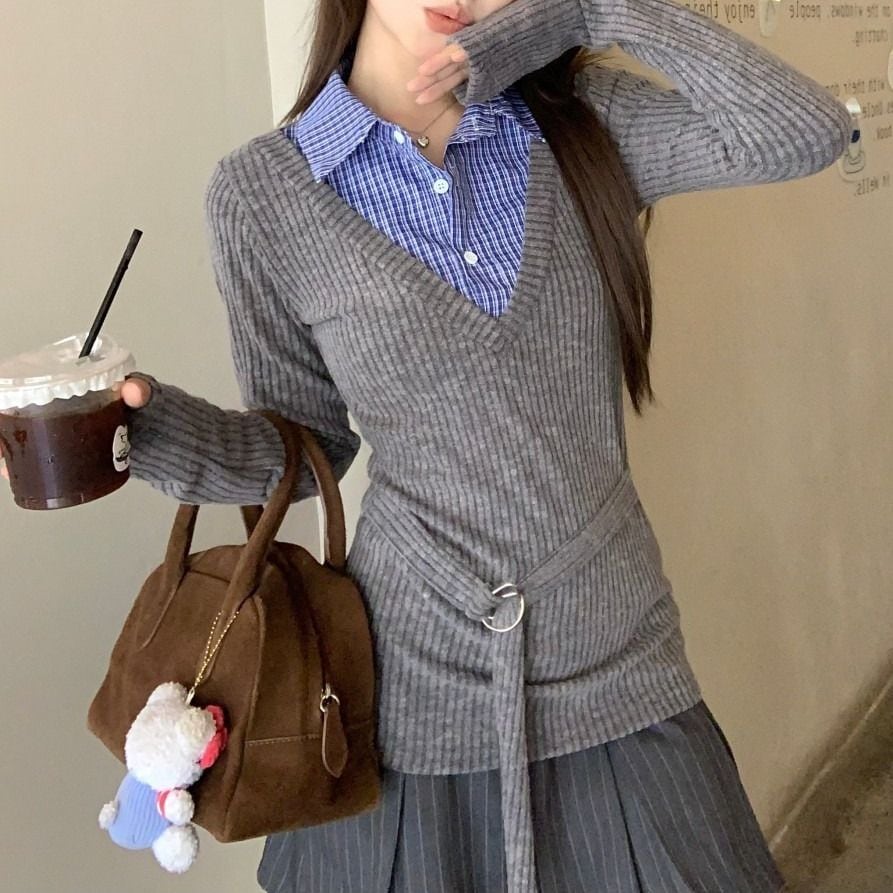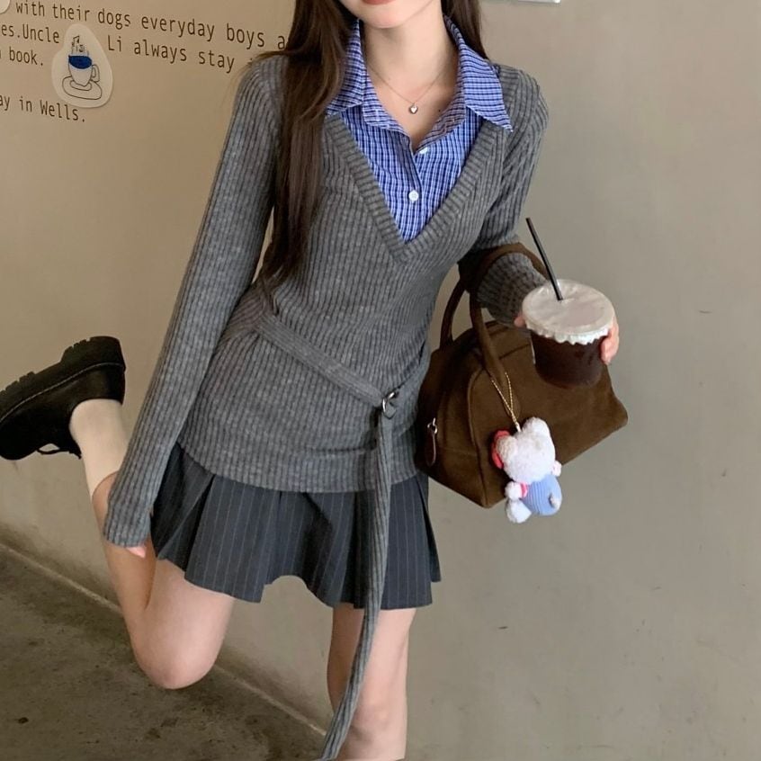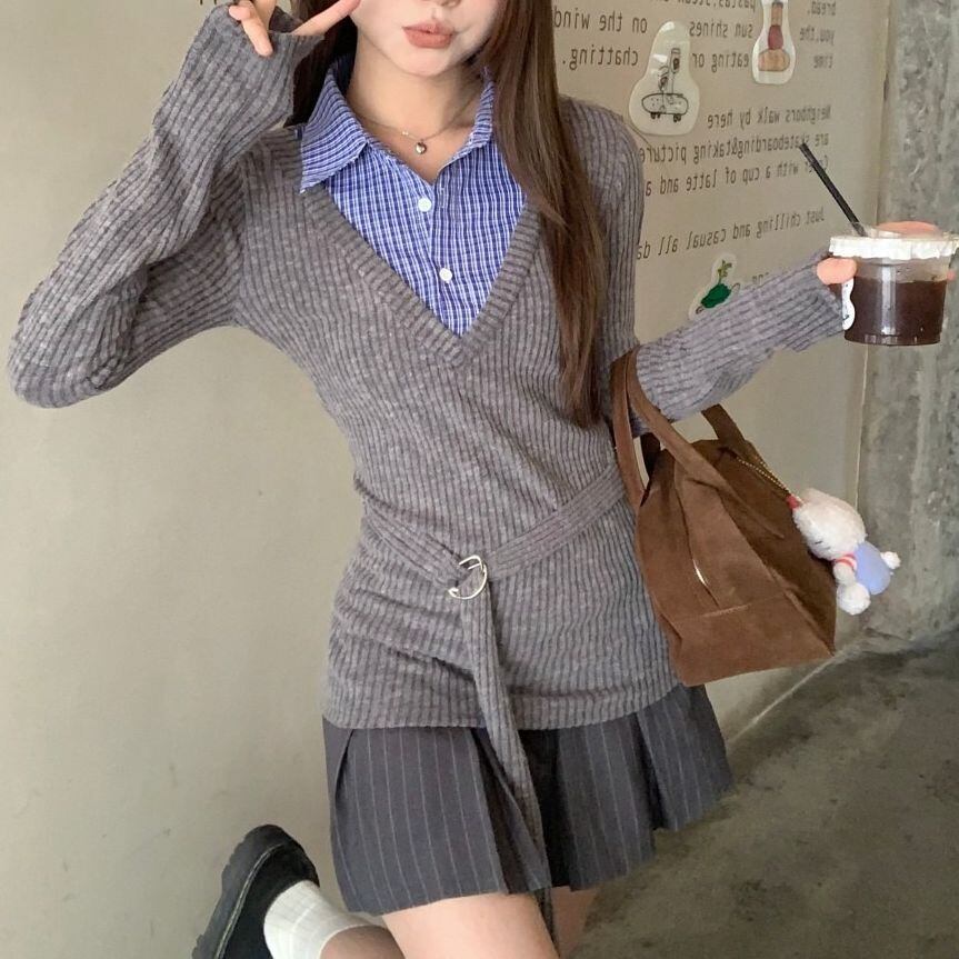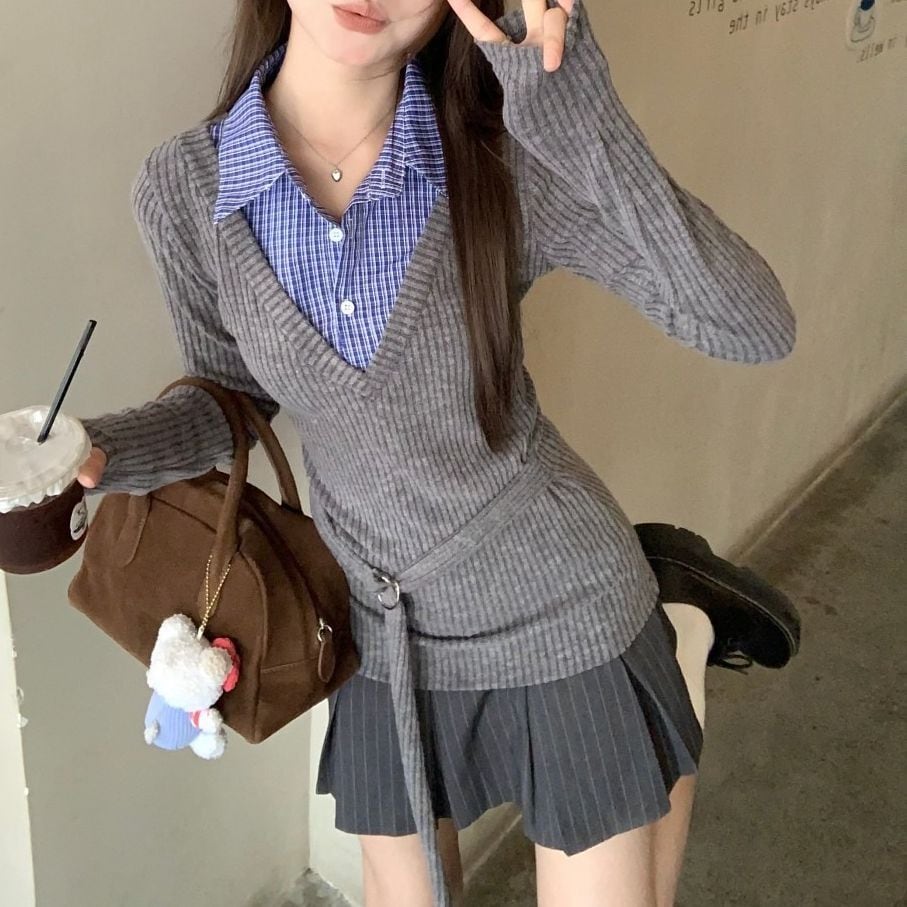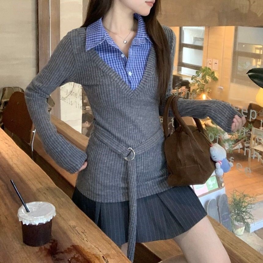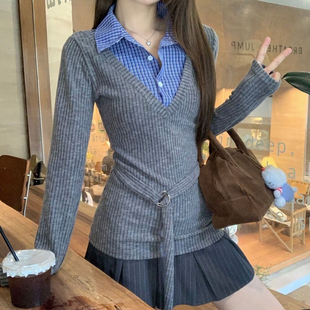 レディース レディースファッション フェイクレイヤード ニット トップス チェック柄 シャツ レイヤードニット トップス スリムフィット 長袖 レトロ 大人可愛い ガーリー カジュアル おしゃれ 通販 韓国 韓国通販 韓国ショッピング 韓国ファッション おるちゃん オルチャン オルチャンファッション 10代 20代 30代 40代 可愛い かわいい お洒落 レディス プチプラ 激安 安い コーデ コーディネイト 人気 おすすめ