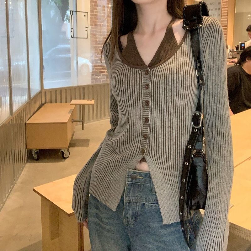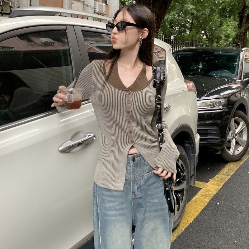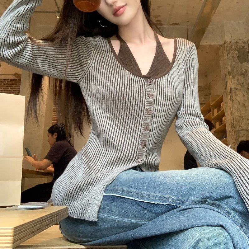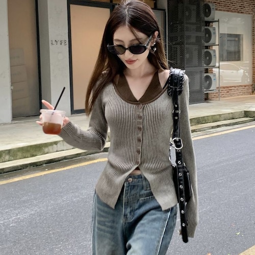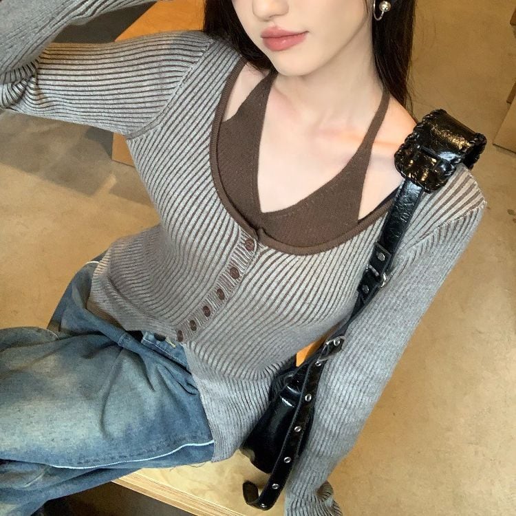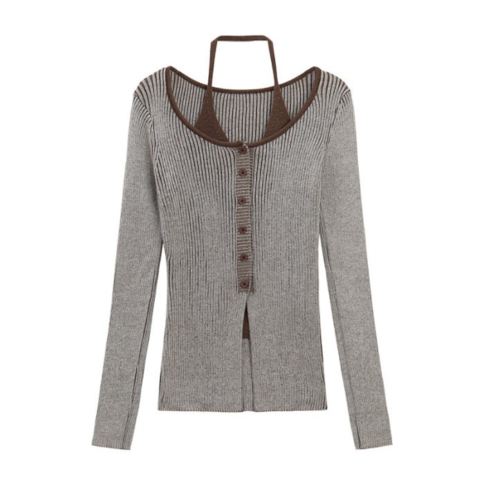 レディース レディースファッション フェイクレイヤード ニット トップス ホルターネック 前ボタン リブニット 配色 スリムフィット 長袖 レトロ 大人可愛い ガーリー カジュアル おしゃれ 通販 韓国 韓国通販 韓国ショッピング 韓国ファッション おるちゃん オルチャン オルチャンファッション 10代 20代 30代 40代 可愛い かわいい お洒落 レディス プチプラ 激安 安い コーデ コーディネイト 人気 おすすめ