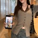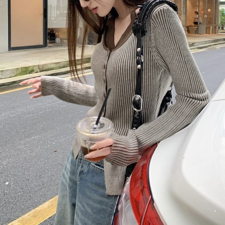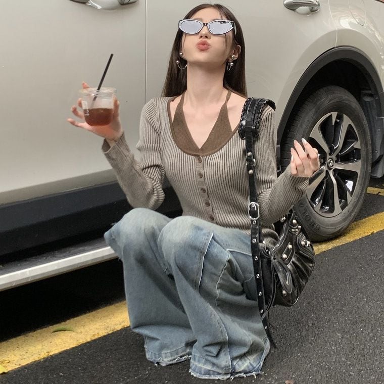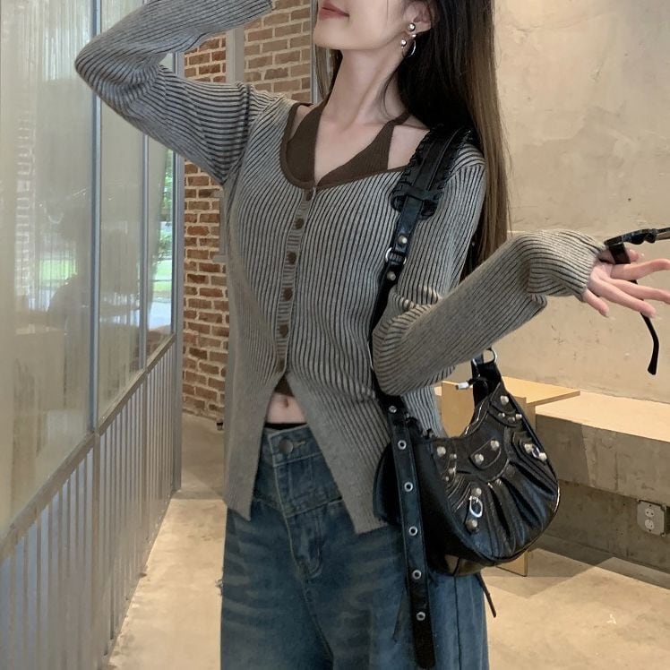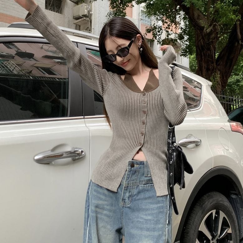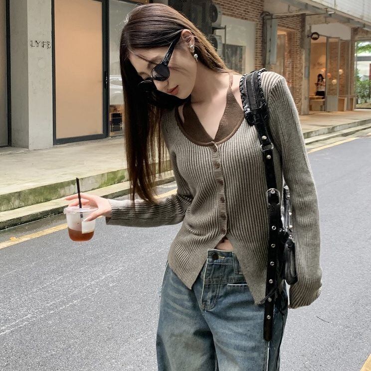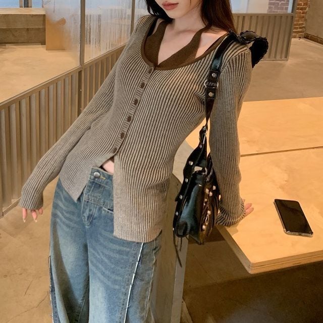 レディース レディースファッション フェイクレイヤード ニット トップス ホルターネック 前ボタン リブニット 配色 スリムフィット 長袖 レトロ 大人可愛い ガーリー カジュアル おしゃれ 通販 韓国 韓国通販 韓国ショッピング 韓国ファッション おるちゃん オルチャン オルチャンファッション 10代 20代 30代 40代 可愛い かわいい お洒落 レディス プチプラ 激安 安い コーデ コーディネイト 人気 おすすめ