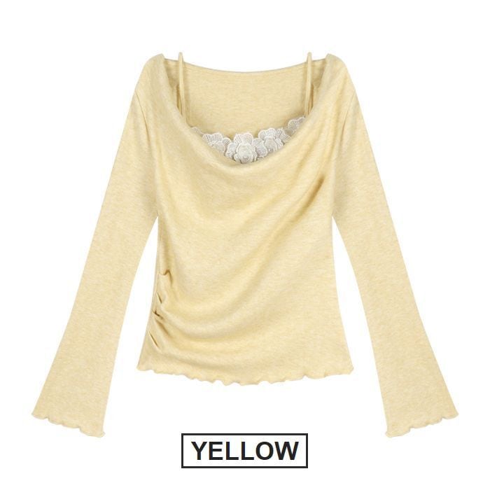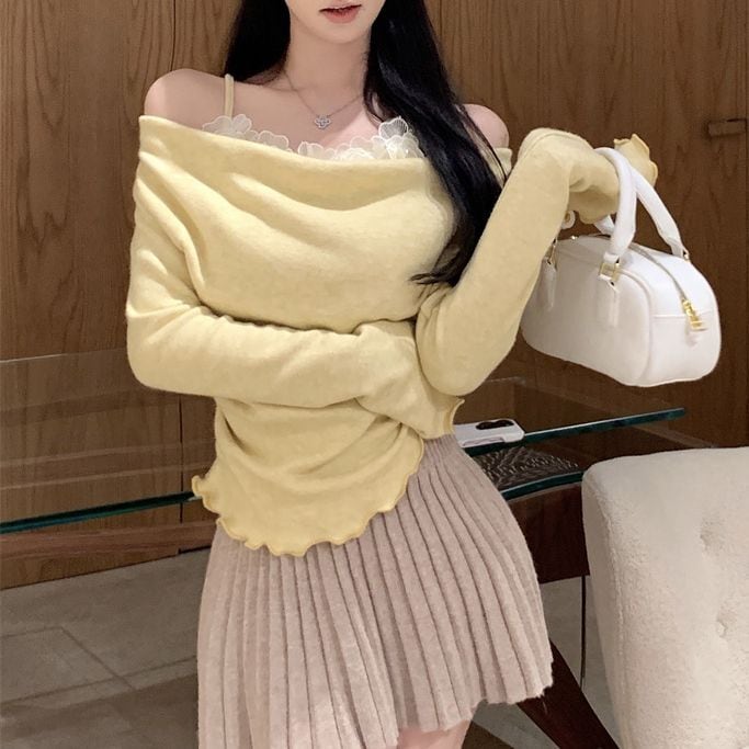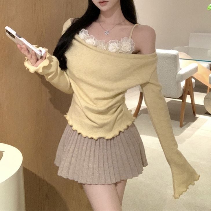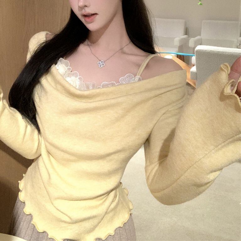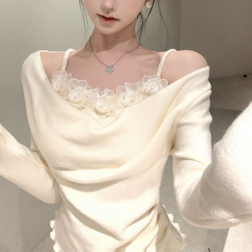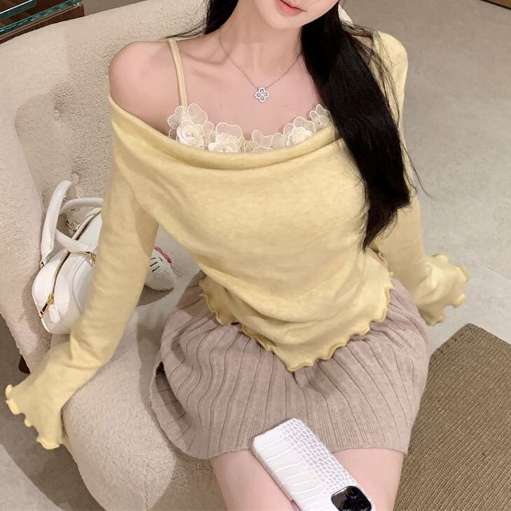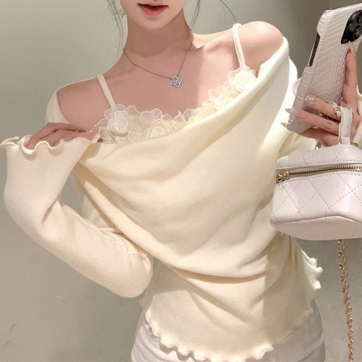 レディース レディースファッション フェイクレイヤード ニット トップス フラワーキャミソール ショート丈 オフショルダー ベルスリーブ スリムフィット フェイクツーピー ス 長袖 レトロ 大人可愛い ガーリー カジュアル おしゃれ 通販 韓国 韓国通販 韓国ショッピング 韓国ファッション おるちゃん オルチャン オルチャンファッション 10代 20代 30代 40代 可愛い かわいい お洒落 レディス プチプラ 激安 安い コーデ コーディネイト 人気 おすすめ