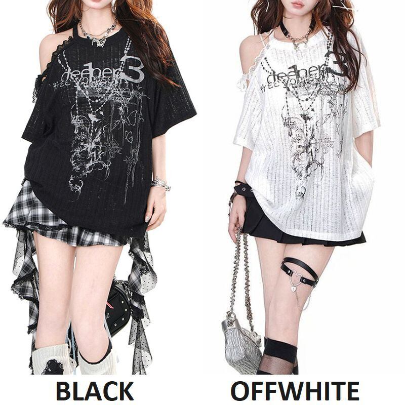 レディース レディースファッション tシャツ オフショルダー レース グラフィックプリント シアー トップス オーバーサイズ クルーネック オフショル ワンショルダー 半袖 レトロ 大人可愛い ガーリー カジュアル サブカル系 ストリート女子 おしゃれ 通販 韓国 韓国通販 韓国ショッピング 韓国ファッション おるちゃん オルチャン オルチャンファッション 10代 20代 30代 40代 可愛い かわいい お洒落 レディス プチプラ 激安 安い コーデ コーディネイト 人気 おすすめ