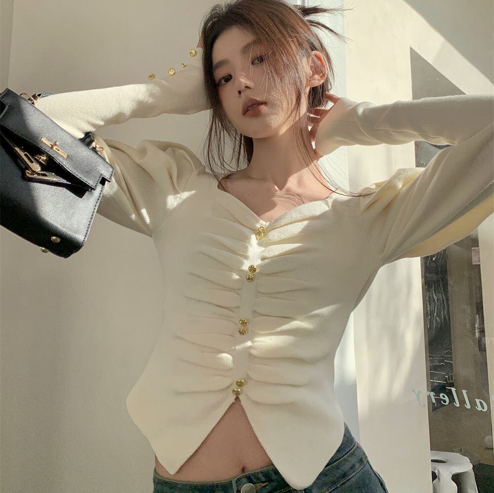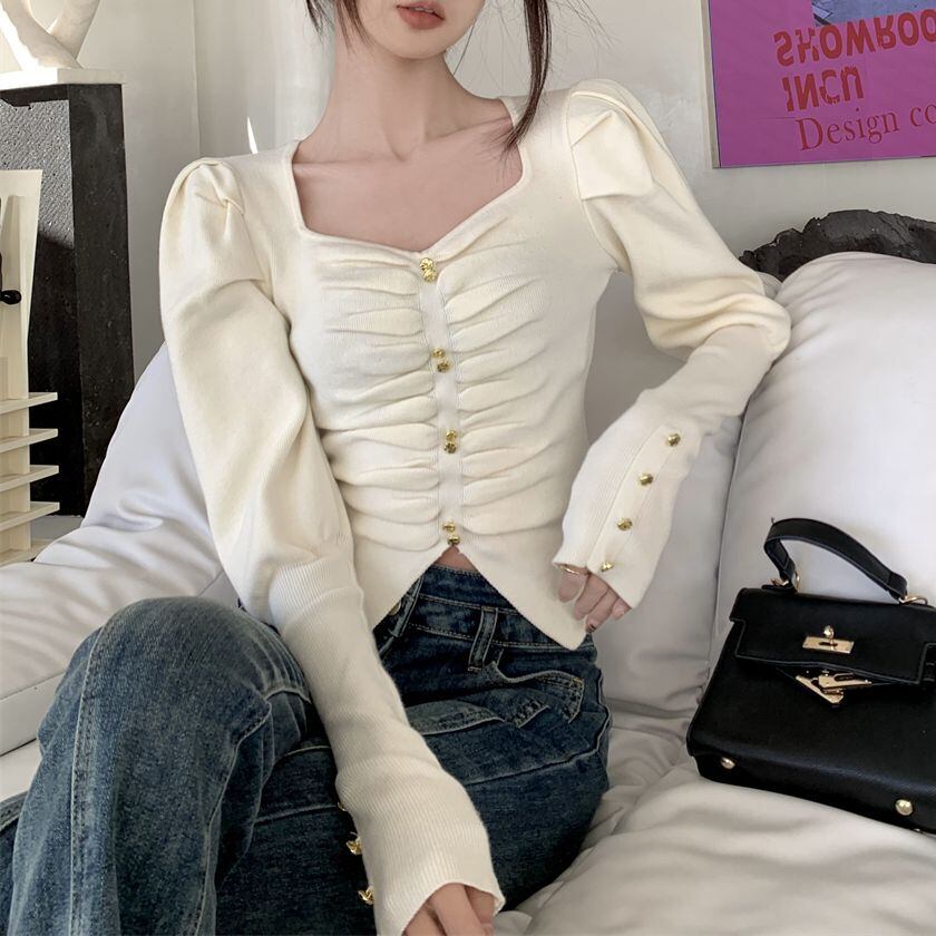 レディース レディースファッション ニット トップス 不規則デザイン スクエアネック ゴールドボタン スリムフィット ドレープ パフスリーブ 長袖 レトロ 大人可愛い ガーリー カジュアル フェミニン おしゃれ 通販 韓国 韓国通販 韓国ショッピング 韓国ファッション おるちゃん オルチャン オルチャンファッション 10代 20代 30代 40代 可愛い かわいい お洒落 レディス プチプラ 激安 安い コーデ コーディネイト 人気 おすすめ