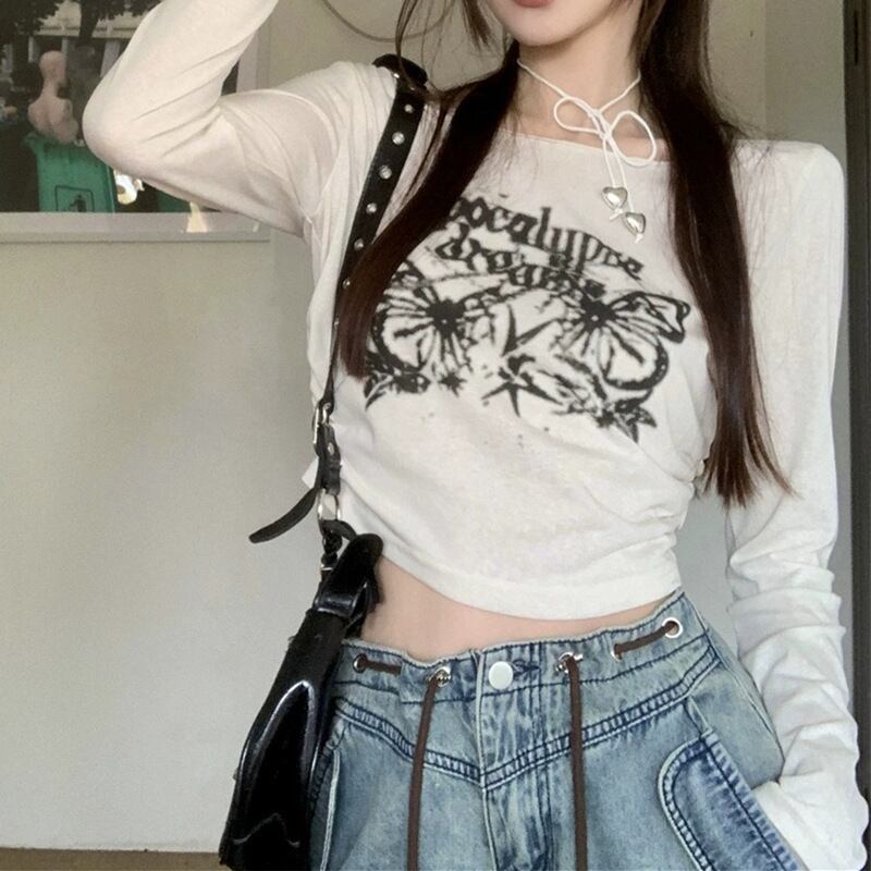 レディース レディースファッション ロンT バタフライ柄 ショート丈 スリムフィット プルオーバー tシャツ スリムtシャツ トップス クルーネック 薄手 長袖 レトロ 大人可愛い ガーリー カジュアル おしゃれ 通販 韓国 韓国通販 韓国ショッピング 韓国ファッション おるちゃん オルチャン オルチャンファッション 10代 20代 30代 40代 可愛い かわいい お洒落 レディス プチプラ 激安 安い コーデ コーディネイト 人気 おすすめ