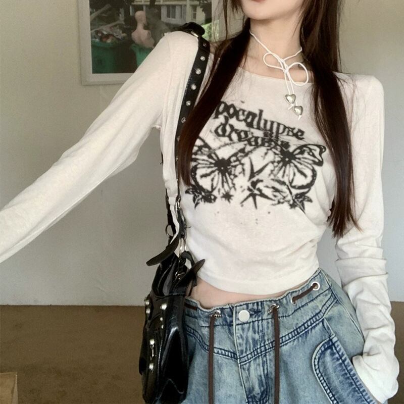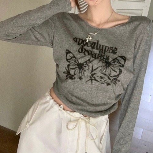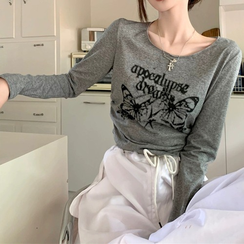 レディース レディースファッション ロンT バタフライ柄 ショート丈 スリムフィット プルオーバー tシャツ スリムtシャツ トップス クルーネック 薄手 長袖 レトロ 大人可愛い ガーリー カジュアル おしゃれ 通販 韓国 韓国通販 韓国ショッピング 韓国ファッション おるちゃん オルチャン オルチャンファッション 10代 20代 30代 40代 可愛い かわいい お洒落 レディス プチプラ 激安 安い コーデ コーディネイト 人気 おすすめ